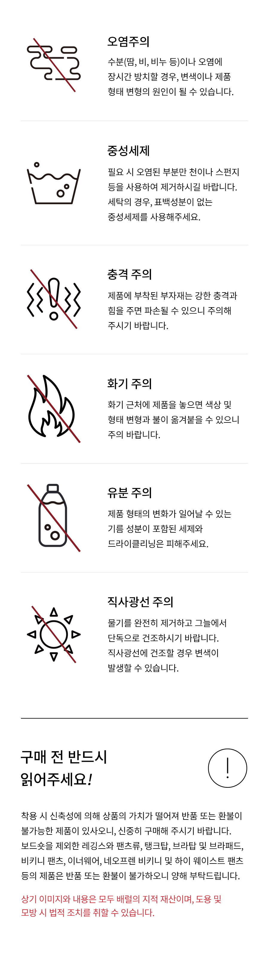 수분(땀, 비, 비누 등)이나 오염에 장시간 방치할 경우, 변색이나 제품 형태 변형의 원인이 될 수 있습니다.