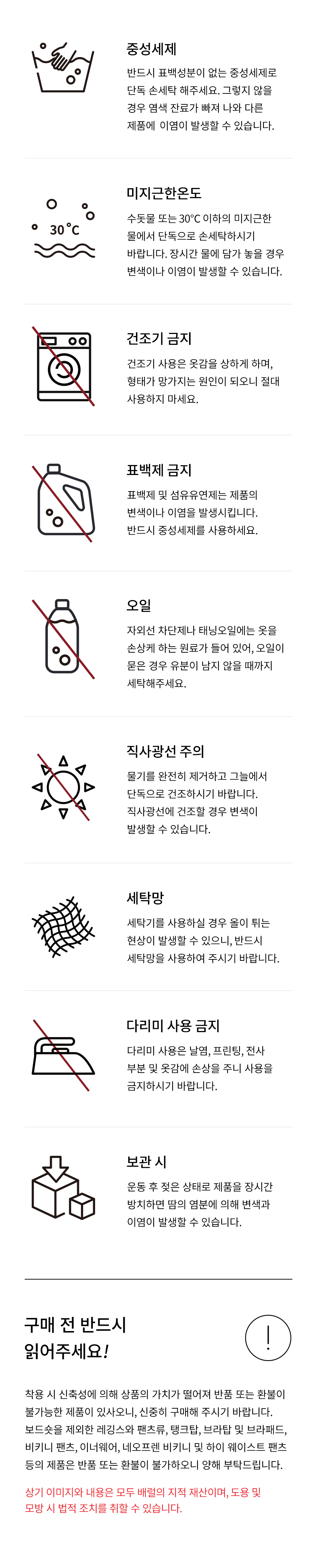 드라이클리닝, 건조기 사용은 옷감을 상하게 하며 형태가 망가지는 원인이 되오니 절대 사용하지 말아주세요.