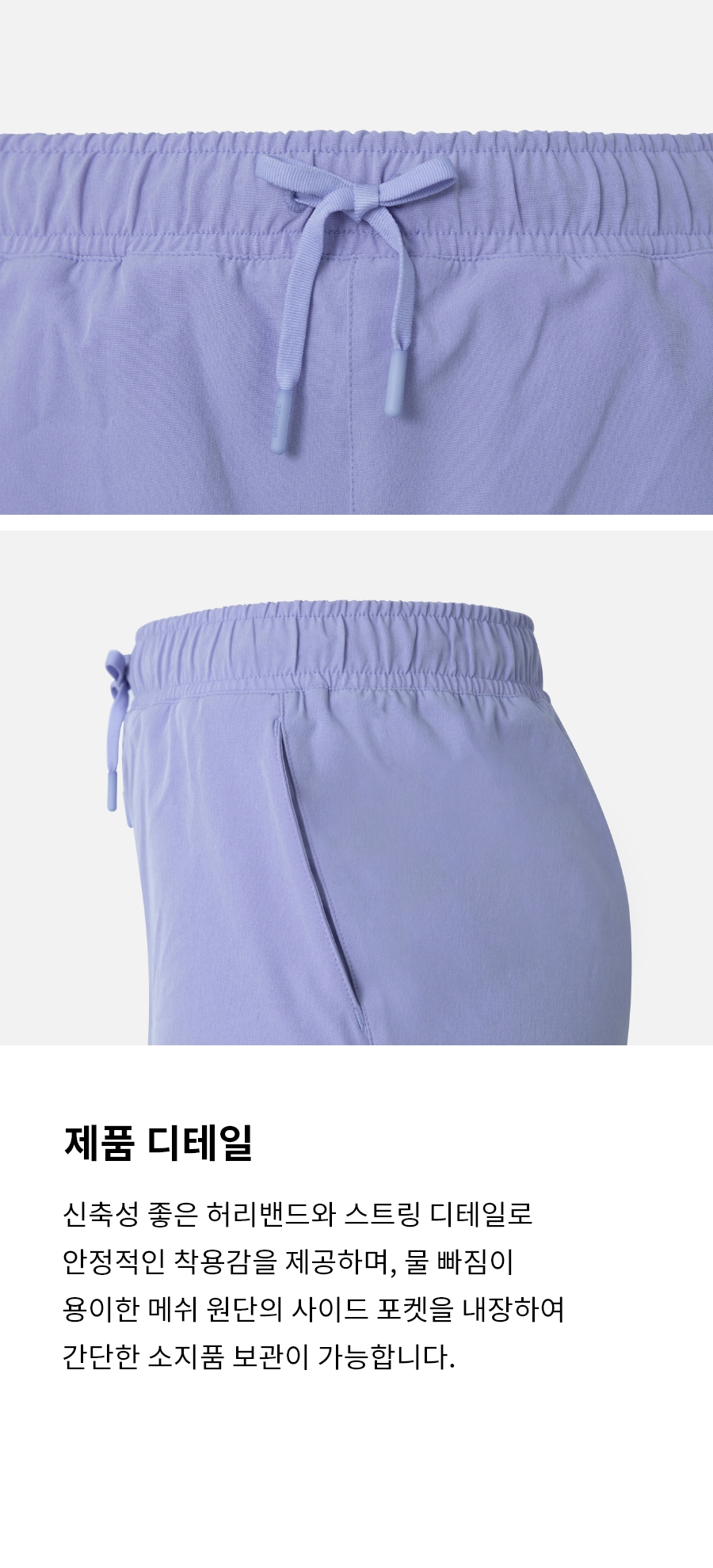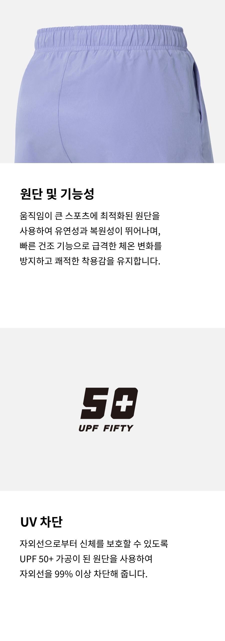 겉감1: 폴리에스터 88%, 폴리우레탄 12% / 겉감2: 폴리에스터 72%, 폴리우레탄 28% / 안감1: 폴리에스터 91%, 폴리우레탄 9% / 안감2: 폴리에스터 79%, 폴리우레탄 21%