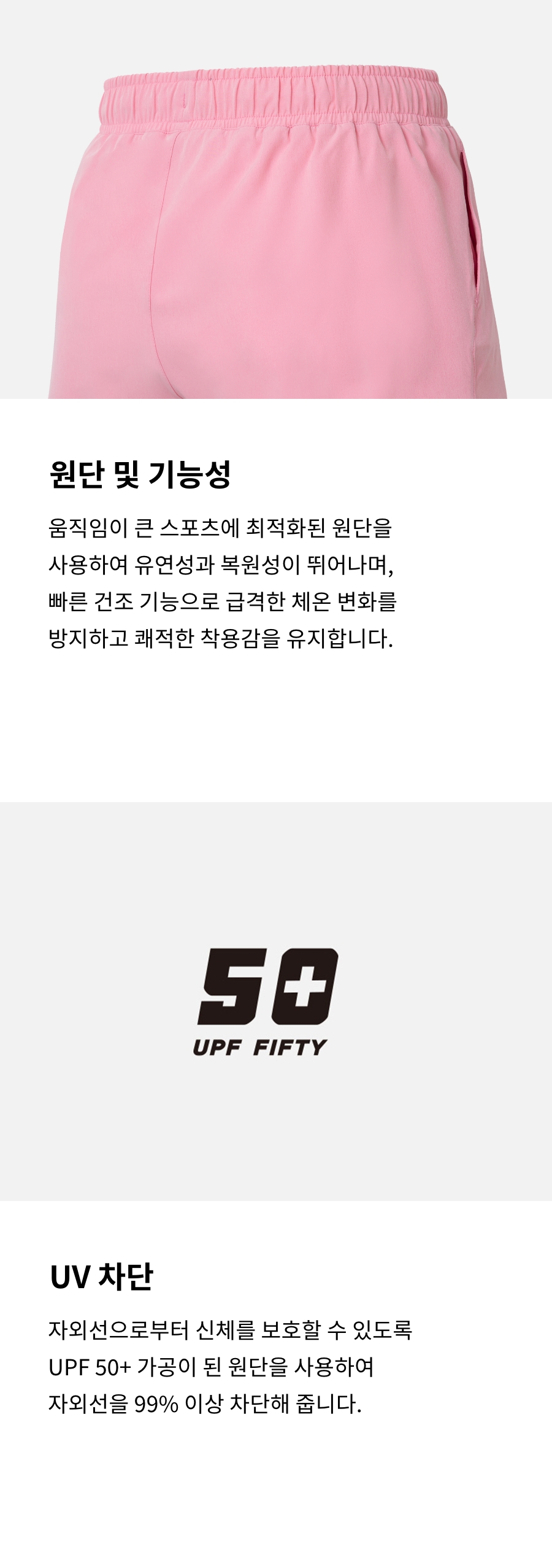 겉감1: 폴리에스터 88%, 폴리우레탄 12% / 겉감2: 폴리에스터 72%, 폴리우레탄 28% / 안감1: 폴리에스터 91%, 폴리우레탄 9% / 안감2: 폴리에스터 79%, 폴리우레탄 21%