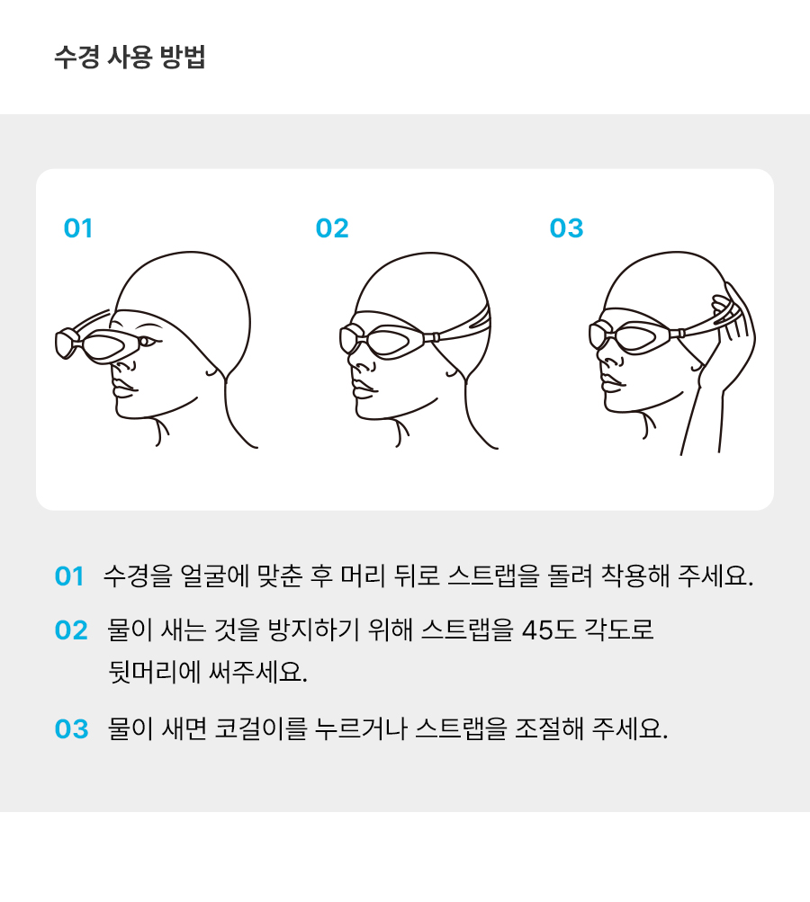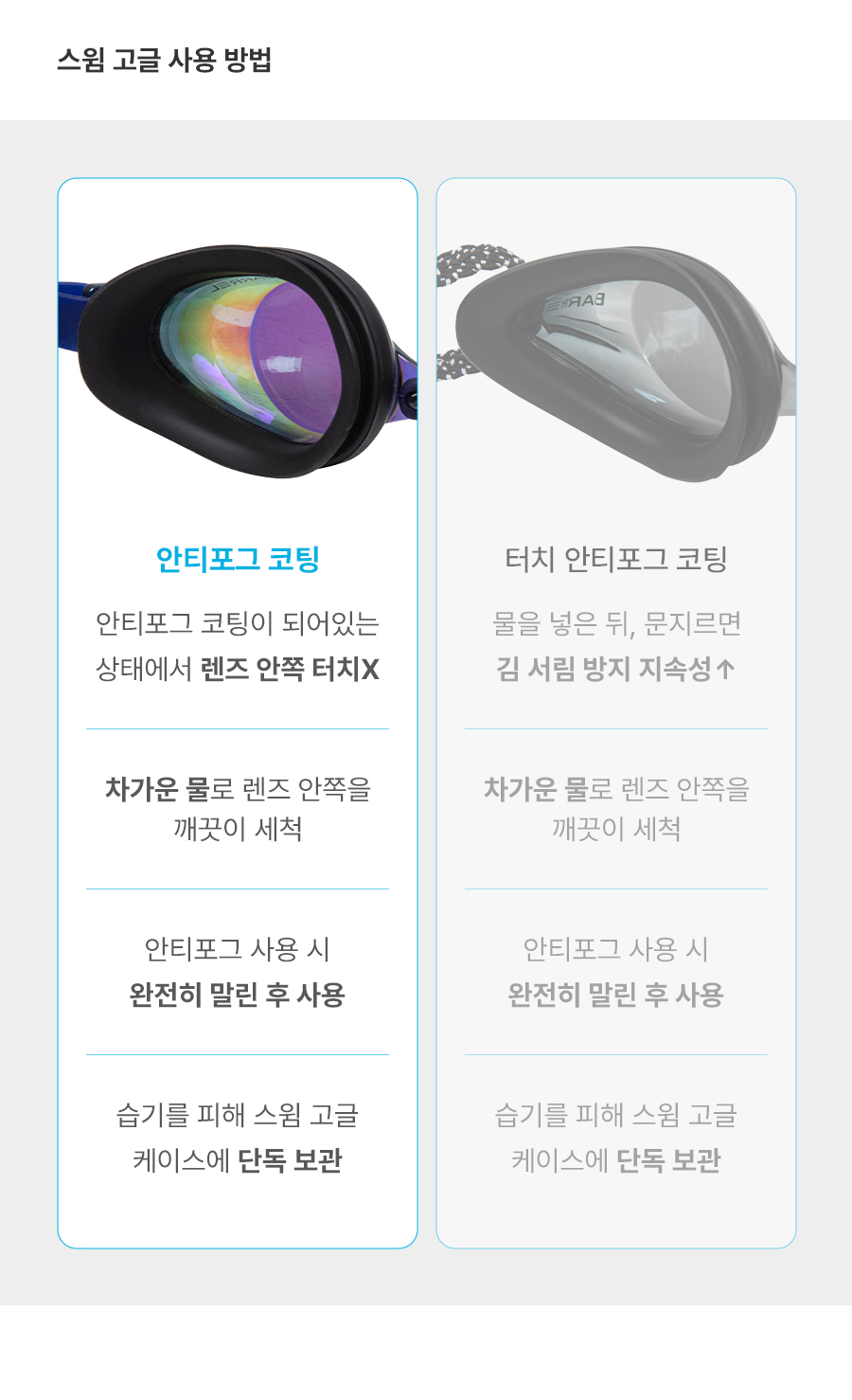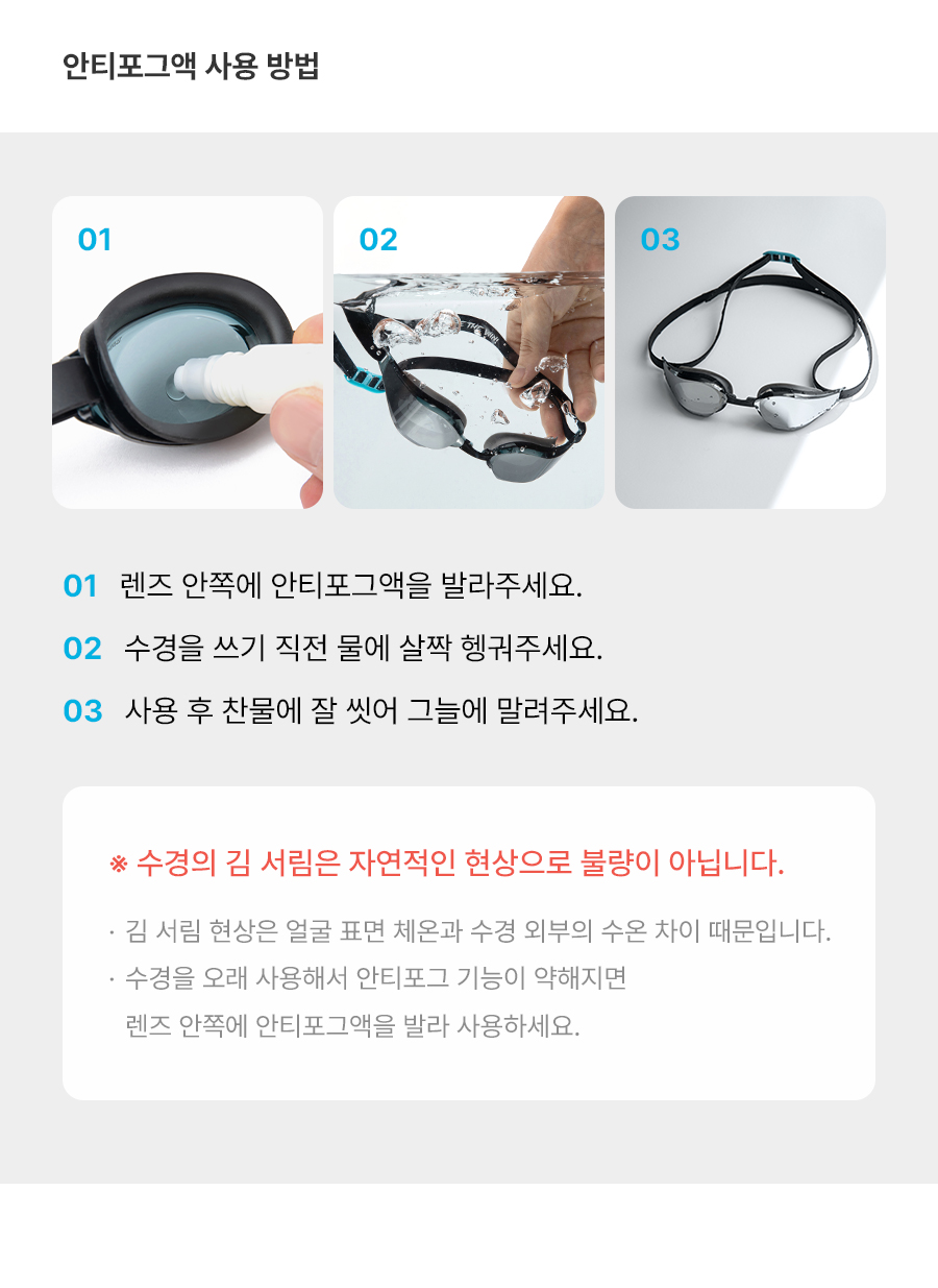수경&스노클마스크 전용 김 서림 방지 용액을 사용 시, 물로 깨끗이 헹군 후 보관하시기 바랍니다.
