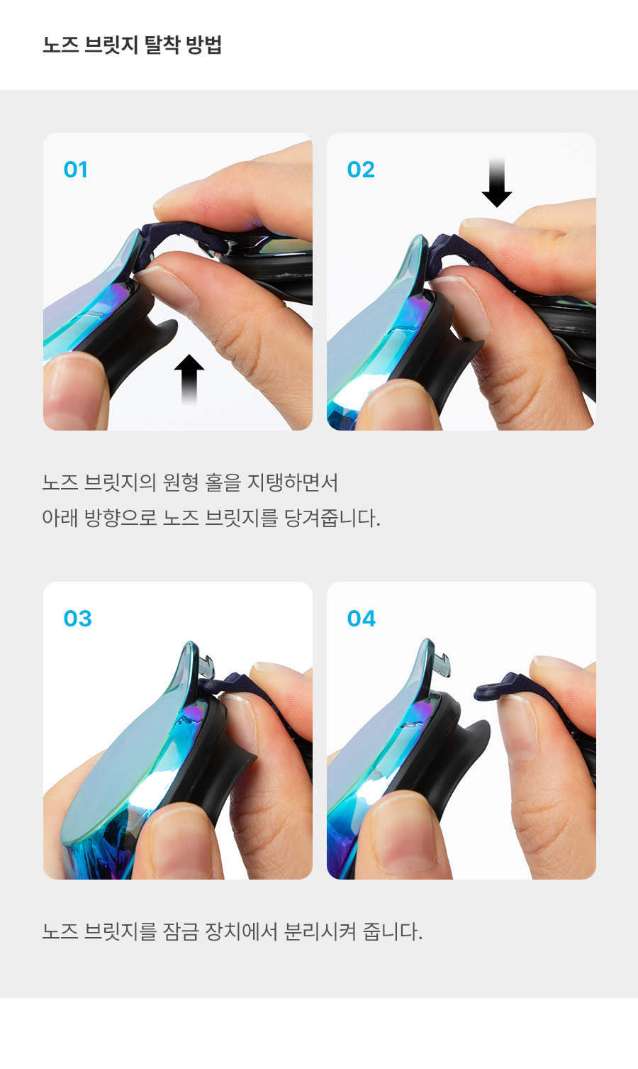 1. 수경 세척 시 중성 세제를 1~2방울 렌즈 표면에 떨어뜨린 후 물에 헹구어 반드시 서늘하고 건조한 곳에 보관해주세요. 2. 알코올이나 시너 등의 유기 용액은 제품의 변형을 일으킬 수 있으니 삼가해주세요. 3. 제품 사용 중 태양을 직접 보지 않도록 주의해주시기 바랍니다. 4. 렌즈 안쪽 면은 김서림 방지를 위해 특수 코팅처리 되었습니다. 타월이나 손톱으로 문지르지 마시기 바랍니다. 5. 열기가 있는 곳에 두거나 젖은 수모와 수경을 장시간 함께 보관 시 제품 변형이 발생할 수 있으니 주의해주시기 바랍니다.