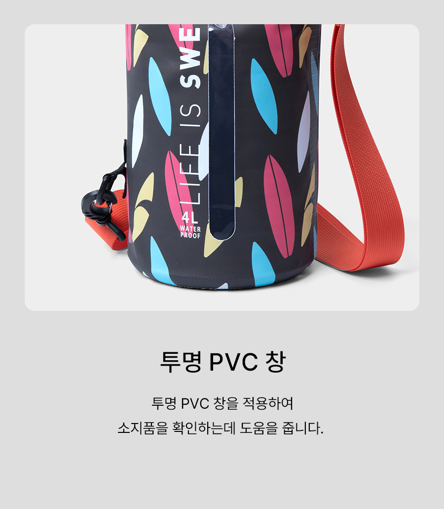 PVC원단은 질기고 내마모성이 우수한 원단입니다. 데미지에 강하고 물세탁 후나 물에 젖어도 강도는 변함없습니다. 단, 세탁시에는 손세탁해주세요. (세탁기 사용금지) 젖은 세탁물을 오래 넣어두시면 옷감이 변질 될 수 있습니다.
