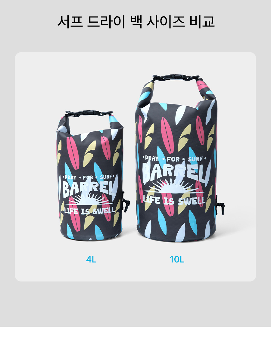 드라이 백은 젖은 물건이나 젖으면 안되는 물건을 보관, 이동할 때 사용하는 제품입니다. 잠수 혹은 스쿠버다이빙 등 수중에서의 완전 방수가 아닌 파도나 비 등을 막아주는 생활 방수입니다.