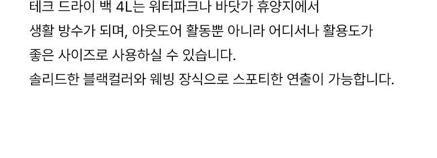 드라이 백은 젖은 물건이나 젖으면 안되는 물건을 보관, 이동할 때 사용하는 제품입니다. 잠수 혹은 스쿠버다이빙 등 수중에서의 완전 방수가 아닌 파도나 비 등을 막아주는 생활 방수입니다.