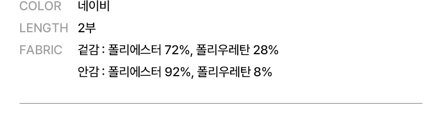 겉감: 폴리에스터 72%, 폴리우레탄 28% / 안감: 폴리에스터 92%, 폴리우레탄 8%