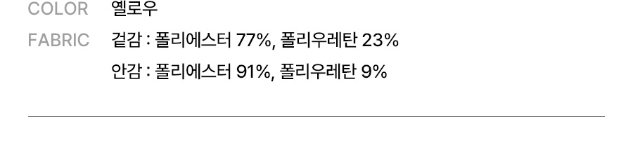 겉감: 폴리에스터 77%, 폴리우레탄 23% / 안감: 폴리에스터 91%, 폴리우레탄 9%