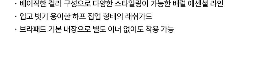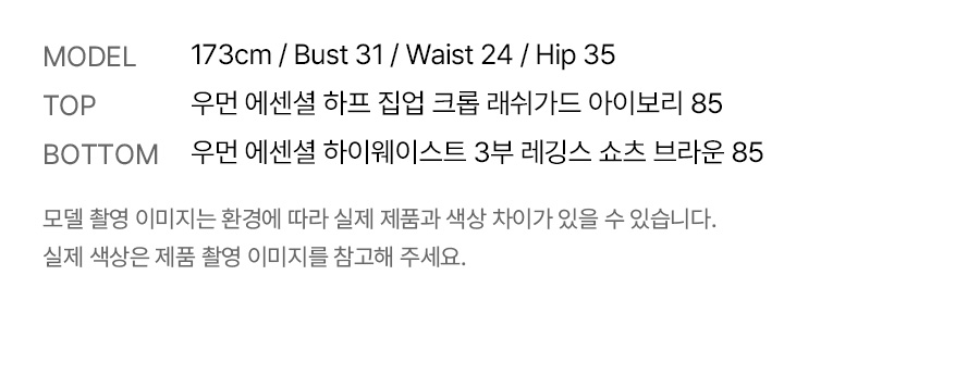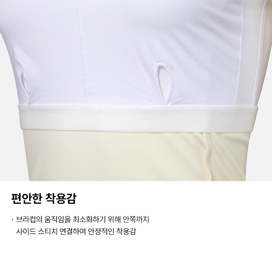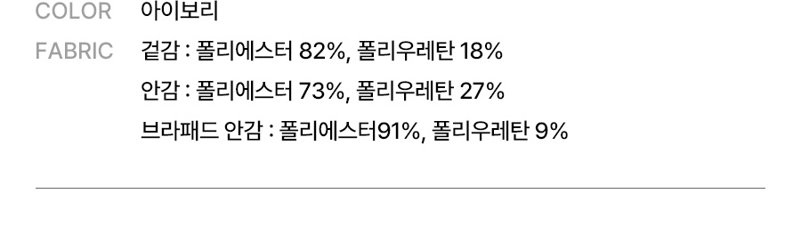 겉감: 폴리에스터 82%, 폴리우레탄 18% / 안감: 폴리에스터 73%, 폴리우레탄 27% / 브라패드 안감: 폴리에스터91%, 폴리우레탄 9%