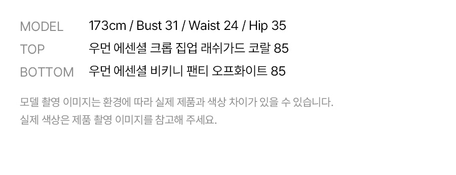 제품을 입고 바닷가나 수영장을 다녀오신 경우, 물 속의 화학성분 및 염분으로 인해 변색이 발생합니다. 땀으로 인한 부분 탈색이 발생할 수 있으니 가능한 한 빨리 수돗물로 세탁하시고 가볍게 두드려서 수분을 뺀 뒤, 직사광선을 피해 그늘에서 건조해주세요.