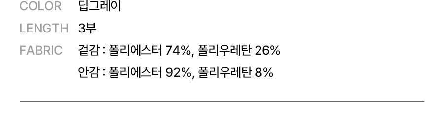겉감: 폴리에스터 74%, 폴리우레탄 26% / 안감: 폴리에스터 92%, 폴리우레탄 8%