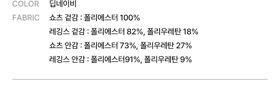 쇼츠 겉감: 폴리에스터 100% / 레깅스 겉감: 폴리에스터 82% 폴리우레탄 18% / 쇼츠 안감: 폴리에스터 73%, 폴리우레탄 27% / 레깅스 안감: 폴리에스터91%, 폴리우레탄 9%^