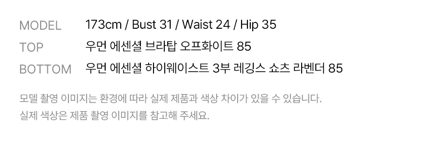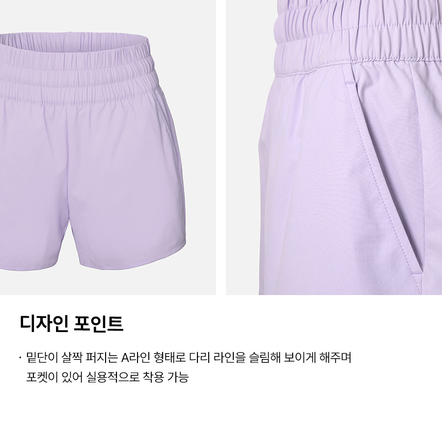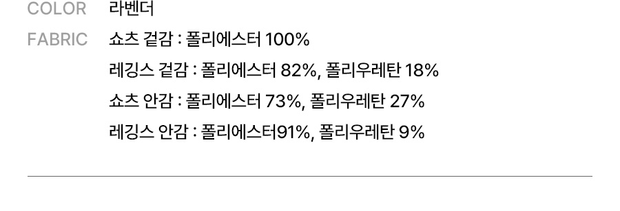 쇼츠 겉감: 폴리에스터 100% / 레깅스 겉감: 폴리에스터 82% 폴리우레탄 18% / 쇼츠 안감: 폴리에스터 73%, 폴리우레탄 27% / 레깅스 안감: 폴리에스터91%, 폴리우레탄 9%