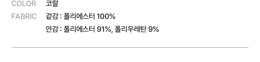 겉감: 폴리에스터 100% / 안감: 폴리에스터 91%, 폴리우레탄 9%