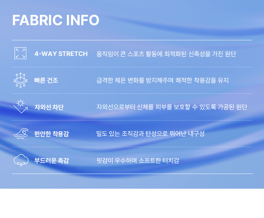 사용 후 즉시 20~30도 사이의 미지근한 물에 소금기가 가실 정도로 씻어주는 것이 좋습니다. 뜨거운 물에 세척하거나 찬물에 오래 방치할 경우 원단 유연성에 변화가 올 수 있습니다.