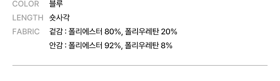 겉감: 폴리에스터 80%, 폴리우레탄 20% / 안감: 폴리에스터 92%, 폴리우레탄 8%