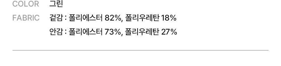겉감: 폴리에스터 82%, 폴리우레탄 18% / 안감: 폴리에스터 73%, 폴리우레탄 27%