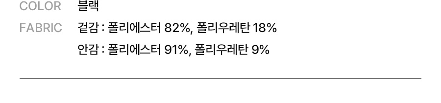 겉감: 폴리에스터 82%, 폴리우레탄 18% / 안감: 폴리에스터 91%, 폴리우레탄 9%