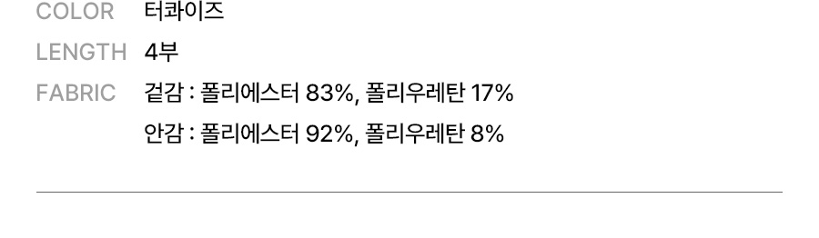 겉감: 폴리에스터 83%, 폴리우레탄 17% / 안감: 폴리에스터 92%, 폴리우레탄 8%