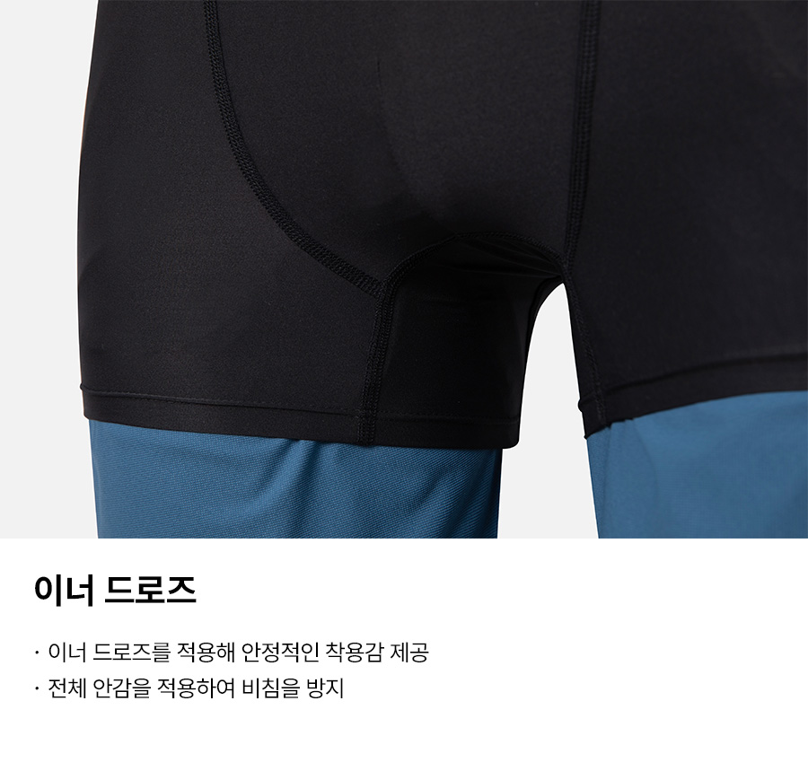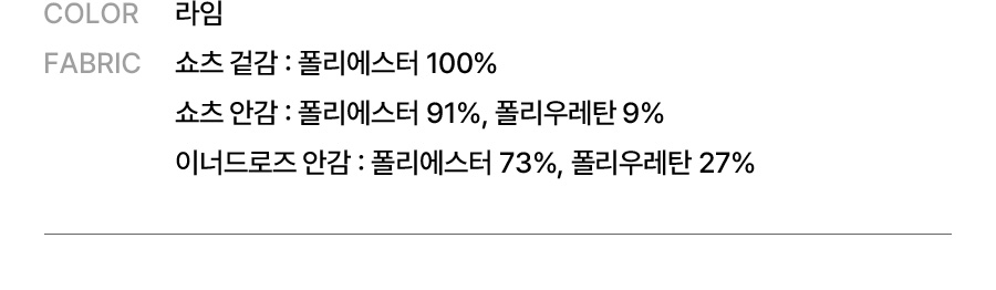 쇼츠 겉감: 폴리에스터 100% / 쇼츠 안감: 폴리에스터 91%, 폴리우레탄 9% / 이너드로즈 안감: 폴리에스터 73%, 폴리우레탄 27%