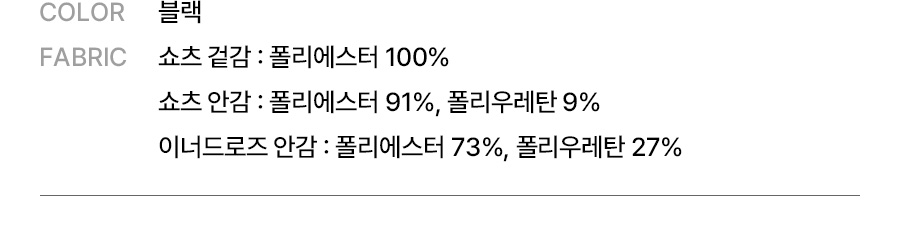 쇼츠 겉감: 폴리에스터 100% / 쇼츠 안감: 폴리에스터 91%, 폴리우레탄 9% / 이너드로즈 안감: 폴리에스터 73%, 폴리우레탄 27%