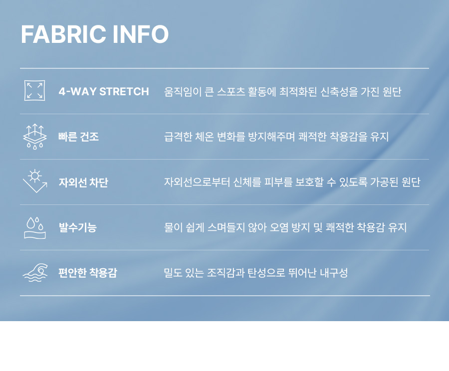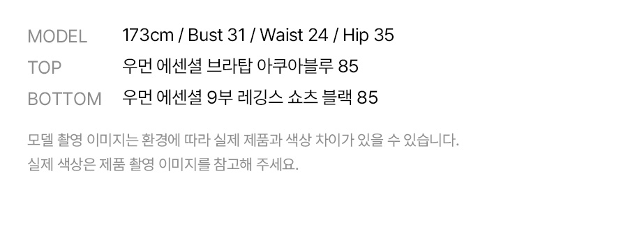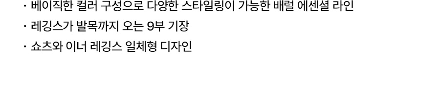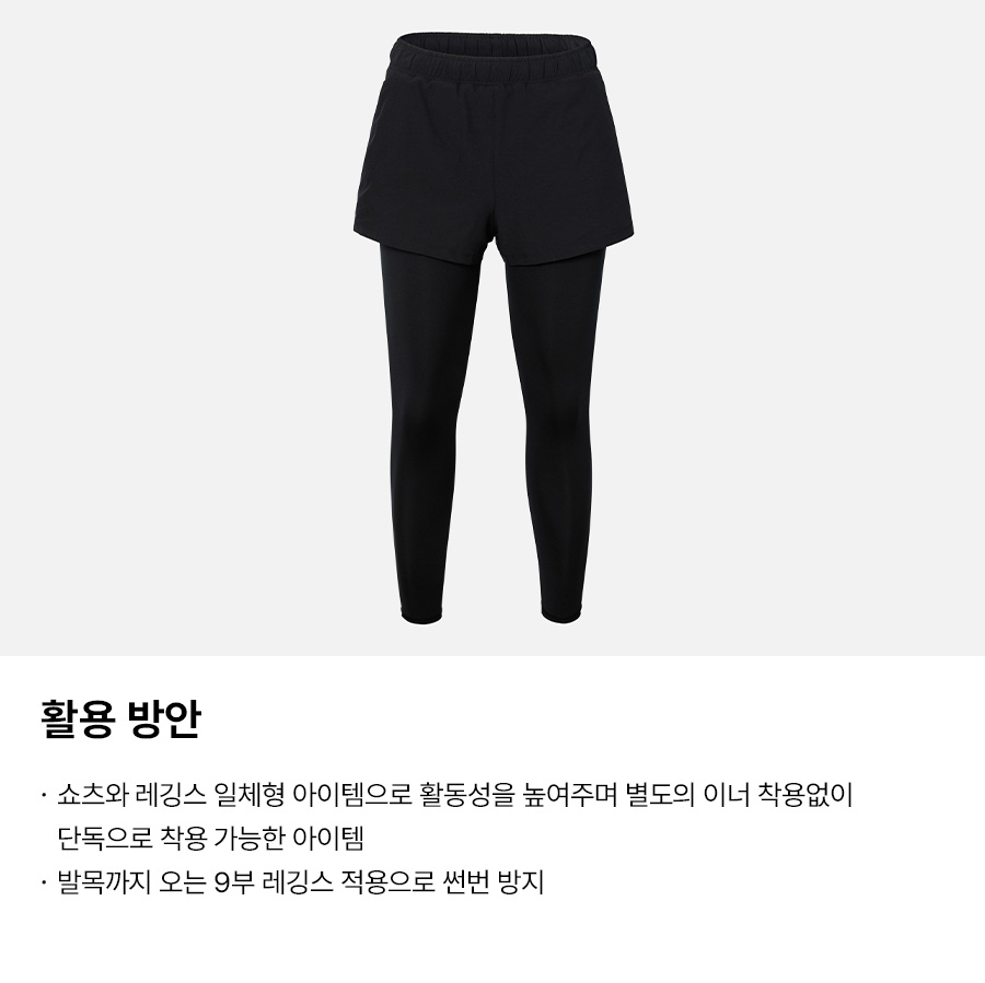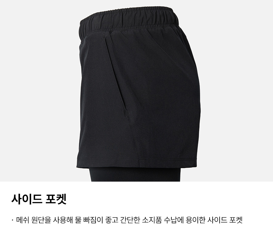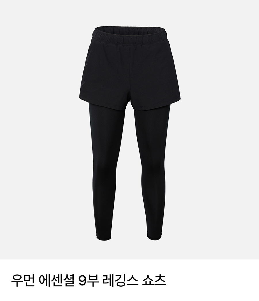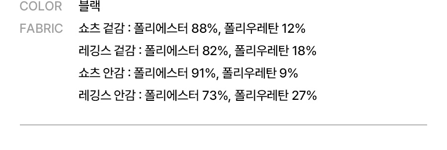 쇼츠 겉감: 폴리에스터 88%, 폴리우레탄 12%, 레깅스 겉감: 폴리에스터 82%, 폴리우레탄 18% / 쇼츠 안감: 폴리에스터 91%, 폴리우레탄 9%, 레깅스 안감: 폴리에스터 73%, 폴리우레탄 27%