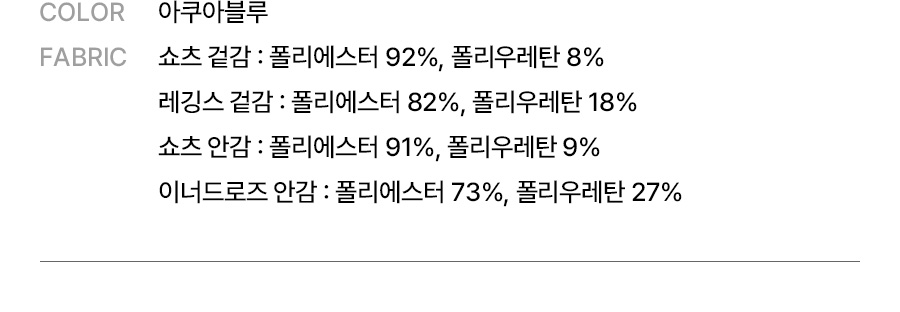쇼츠 겉감: 폴리에스터 92%, 폴리우레탄 8%, 레깅스 겉감: 폴리에스터 82%, 폴리우레탄 18% / 쇼츠 안감: 폴리에스터 91%, 폴리우레탄 9%, 이너드로즈 안감: 폴리에스터 73%, 폴리우레탄 27%