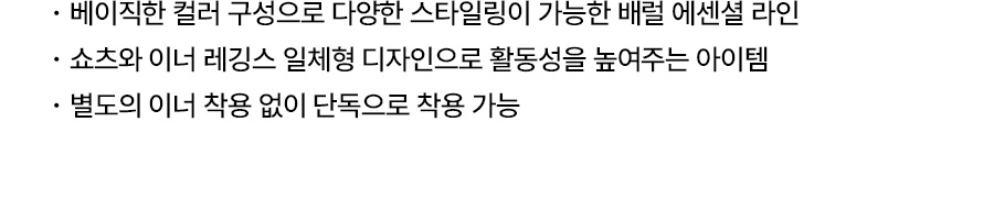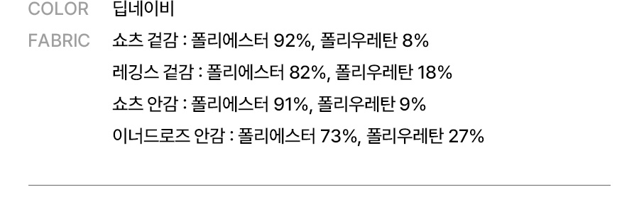 쇼츠 겉감: 폴리에스터 92%, 폴리우레탄 8%, 레깅스 겉감: 폴리에스터 82%, 폴리우레탄 18% / 쇼츠 안감: 폴리에스터 91%, 폴리우레탄 9%, 이너드로즈 안감: 폴리에스터 73%, 폴리우레탄 27%