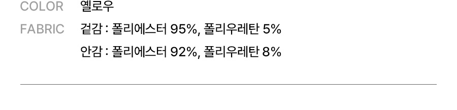 겉감: 폴리에스터 95%, 폴리우레탄 5% / 안감: 폴리에스터 92%, 폴리우레탄 8%