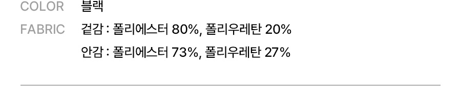 겉감: 폴리에스터 80%, 폴리우레탄 20% / 안감: 폴리에스터 73%, 폴리우레탄 27%