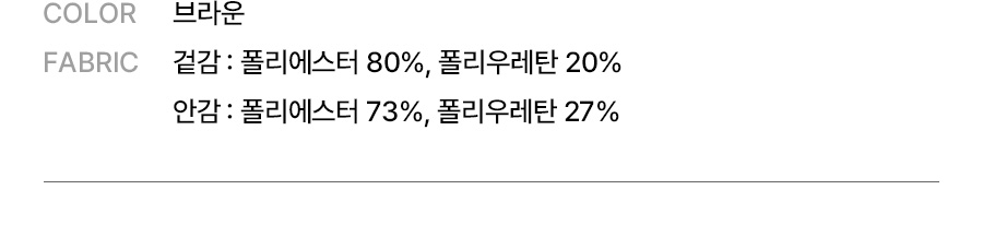 겉감: 폴리에스터 80%, 폴리우레탄 20% / 안감: 폴리에스터 73%, 폴리우레탄 27%