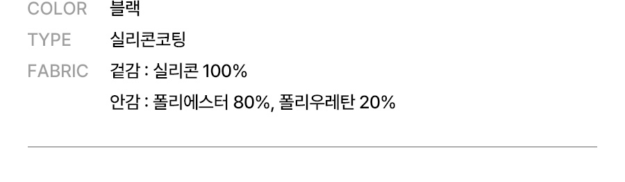 겉감: 실리콘 100% / 안감: 폴리에스터 80%, 폴리우레탄 20%