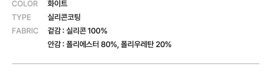 겉감: 실리콘 100% / 안감: 폴리에스터 80%, 폴리우레탄 20%