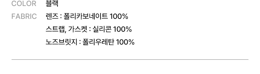 렌즈: 폴리카보네이트 100% / 스트랩: 실리콘 100% / 가스켓: 실리콘 100% / 노즈브릿지: 폴리우레탄 100%