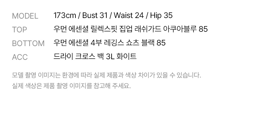 사용 후 즉시 20~30도 사이의 미지근한 물에 소금기가 가실 정도로 씻어주는 것이 좋습니다. 뜨거운 물에 세척하거나 찬물에 오래 방치할 경우 원단 유연성에 변화가 올 수 있습니다.