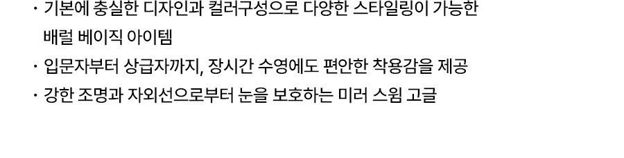 렌즈: 폴리카보네이트 100% / 스트랩: 실리콘 100% / 가스켓: 실리콘 100% / 노즈브릿지: 폴리우레탄 100%