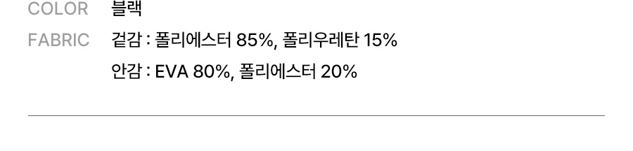 겉감: 폴리에스터 85%, 폴리우레탄 15% / 안감: EVA 80%, 폴리에스터 20%