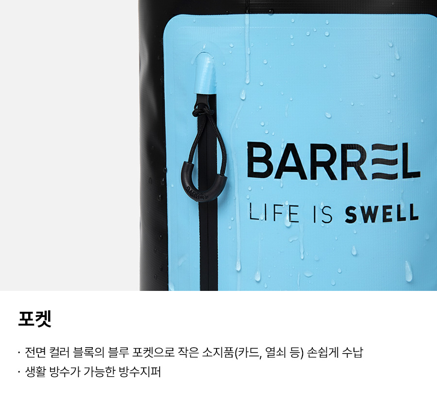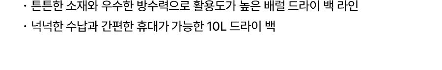 드라이 백은 젖은 물건이나 젖으면 안되는 물건을 보관, 이동할 때 사용하는 제품입니다. 잠수 혹은 스쿠버다이빙 등 수중에서의 완전 방수가 아닌 파도나 비 등을 막아주는 생활 방수입니다.