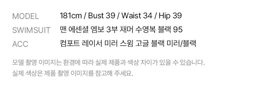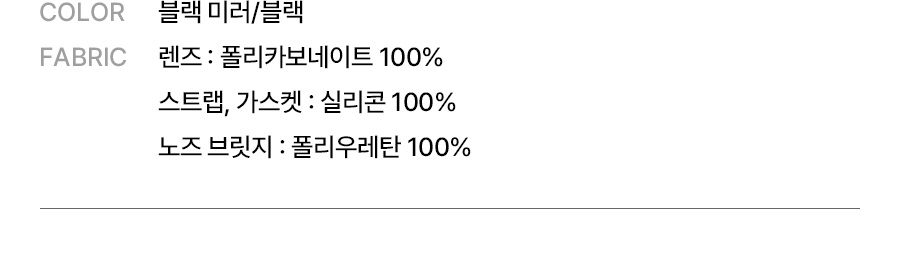 렌즈: 폴리카보네이트 100% / 스트랩: 실리콘 100% / 가스켓: 실리콘 100% / 노즈브릿지: 폴리우레탄 100%