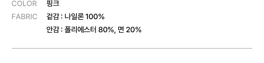 겉감: 나일론 100% / 안감: 폴리에스터 80%, 면 20%