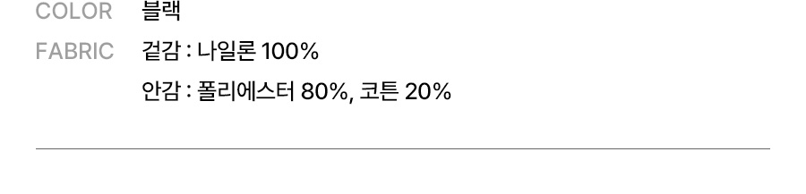 겉감 : 나일론 100% / 안감 : 폴리에스터 80%, 코튼 20%