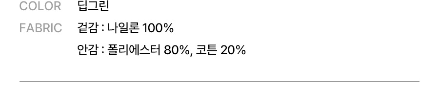 겉감 : 나일론 100% / 안감 : 폴리에스터 80%, 코튼 20%
