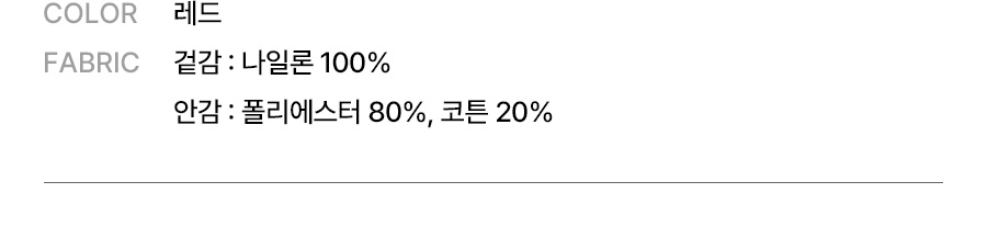겉감 : 나일론 100% / 안감 : 폴리에스터 80%, 코튼 20%