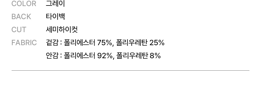 겉감: 폴리에스터 75%, 폴리우레탄 25% / 안감: 폴리에스터 92%, 폴리우레탄 8%