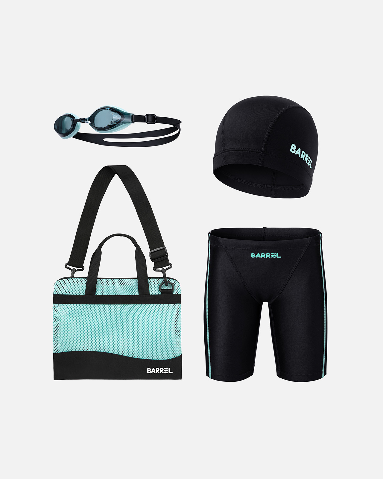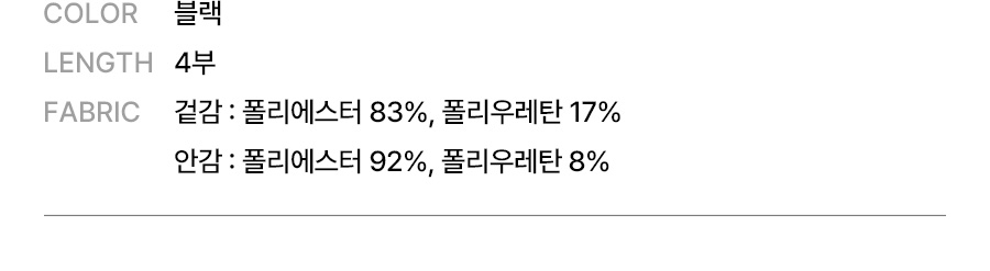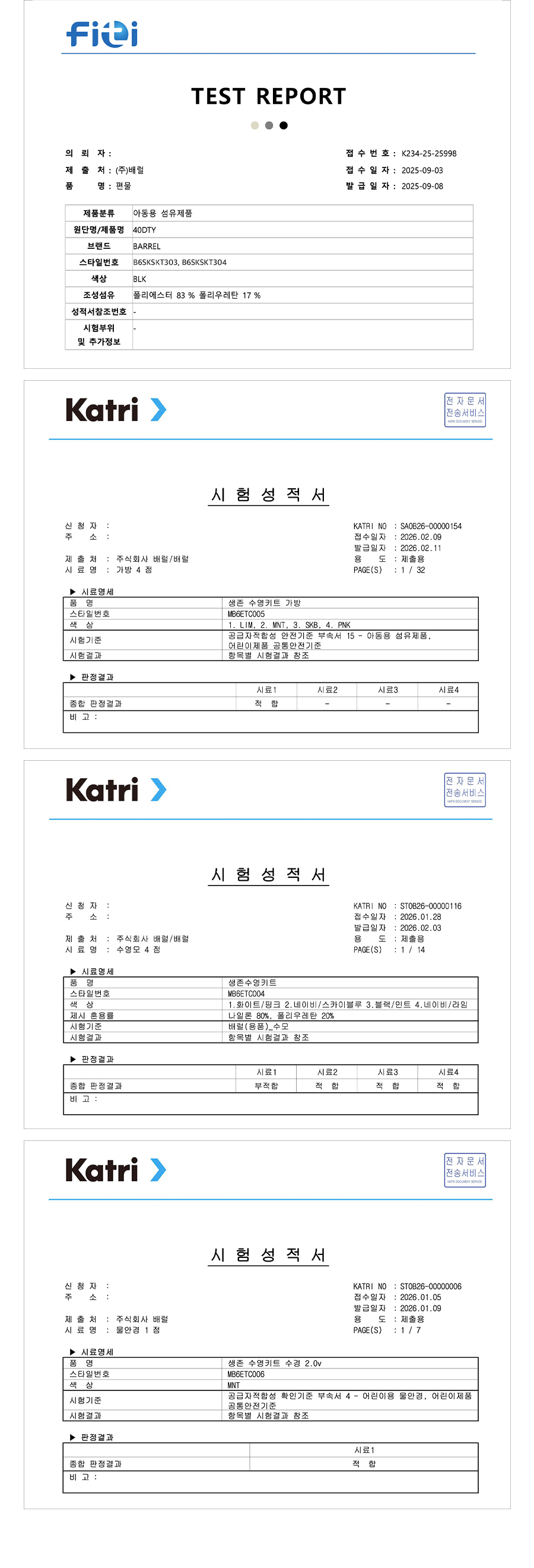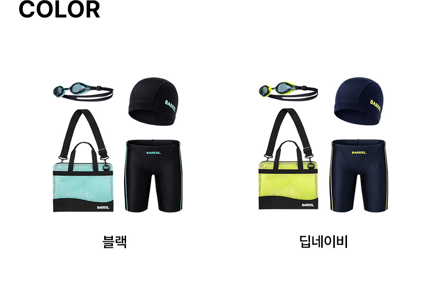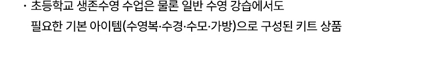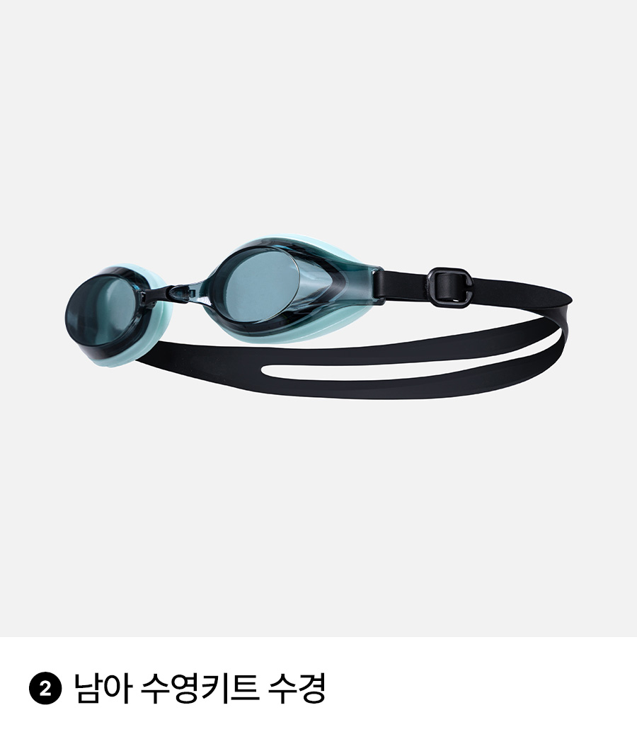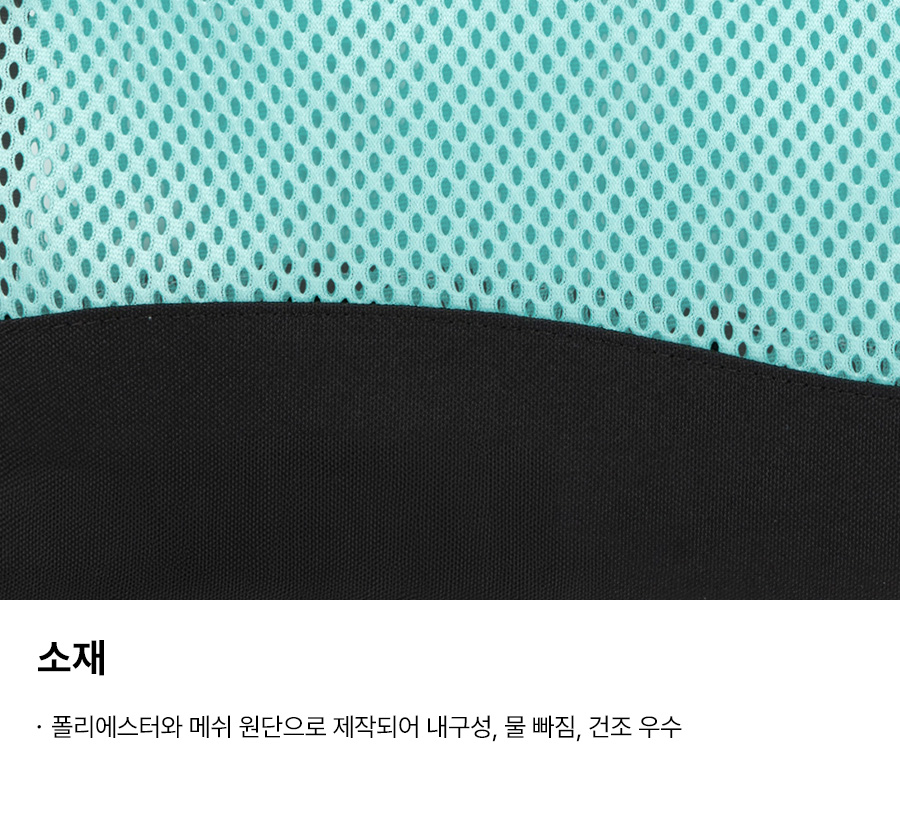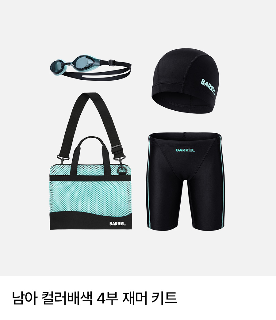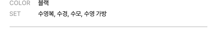 의류 - 겉감: 폴리에스터 83%, 폴리우레탄 17% / 안감: 폴리에스터 92%, 폴리우레탄 8% / 가방 - 폴리에스터 100% / 수경 - 렌즈 : 폴리카보네이트 100%, 가스켓 : 실리콘 100%, 스트랩 : 실리콘 100%, 노즈브릿지 : 우레탄 100% / 수모 - 나일론 80%, 폴리우레탄 20%