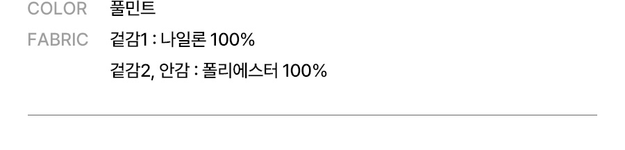 겉감1: 나일론 100%, 겉감2: 폴리에스터 100%/ 안감: 폴리에스터 100%