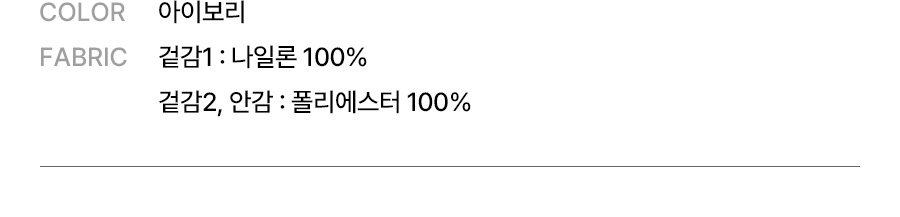 겉면 1: 나일론 100%, 겉면 2: 폴리에스터 100%/ 안감: 폴리에스터 100%