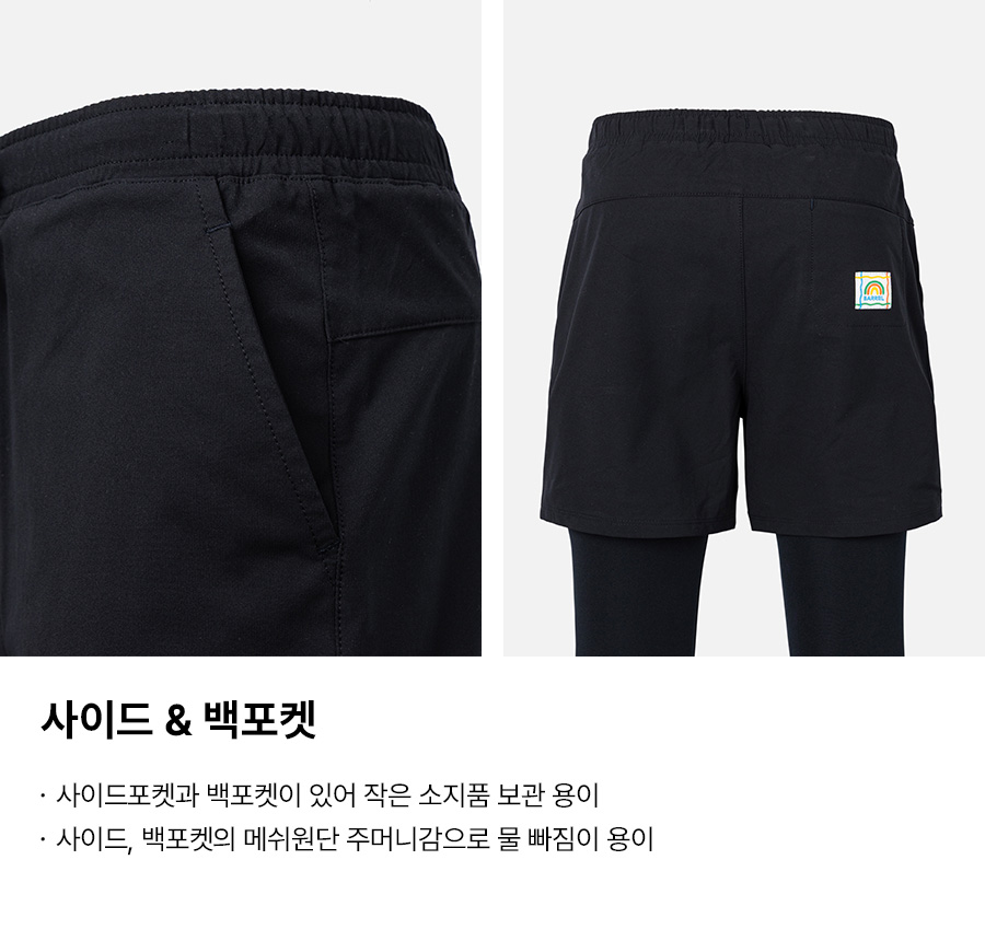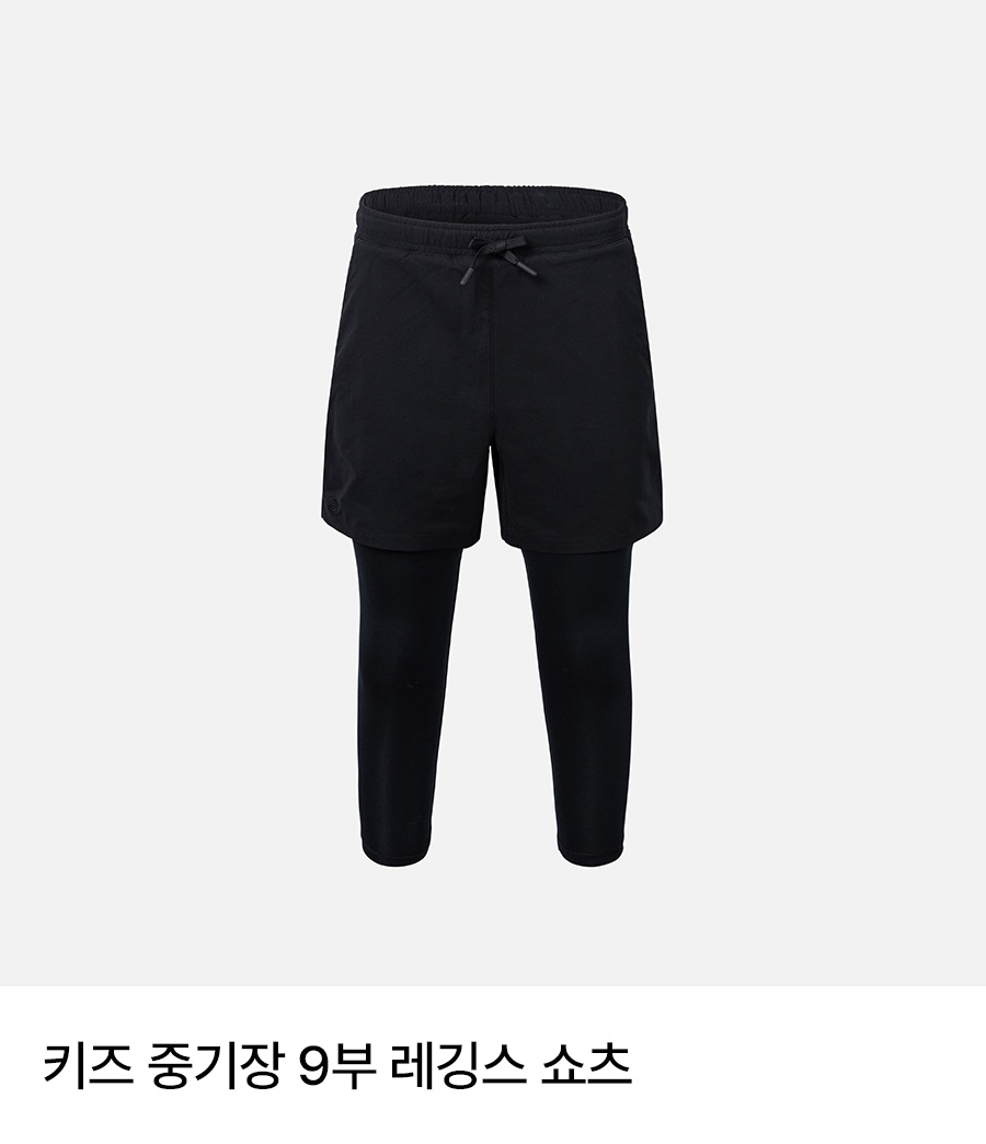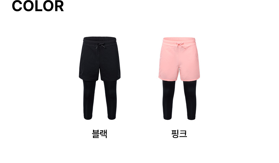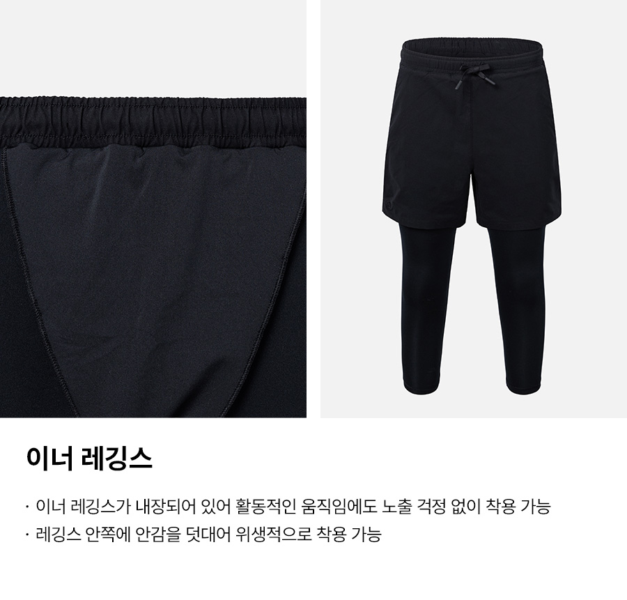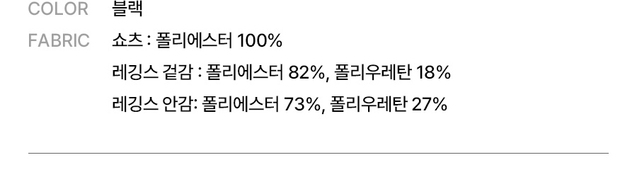 쇼츠: 폴리에스터 100% / 레깅스 겉감: 폴리에스터 82%, 폴리우레탄 18% / 레깅스 안감: 폴리에스터 73%, 폴리우레탄 27%