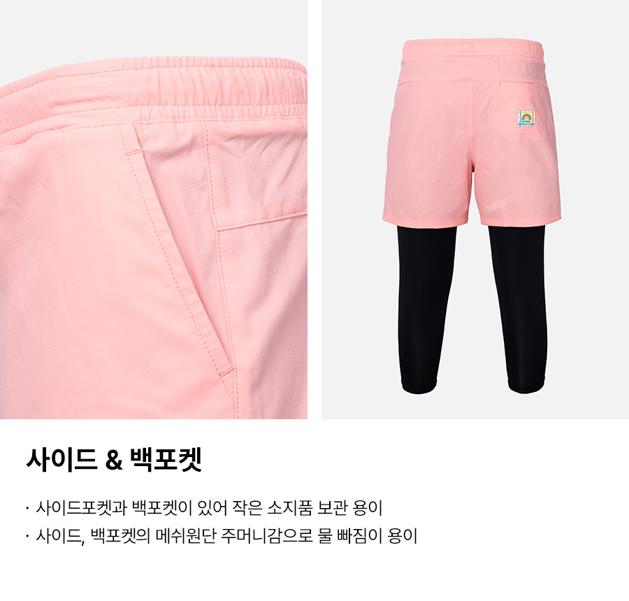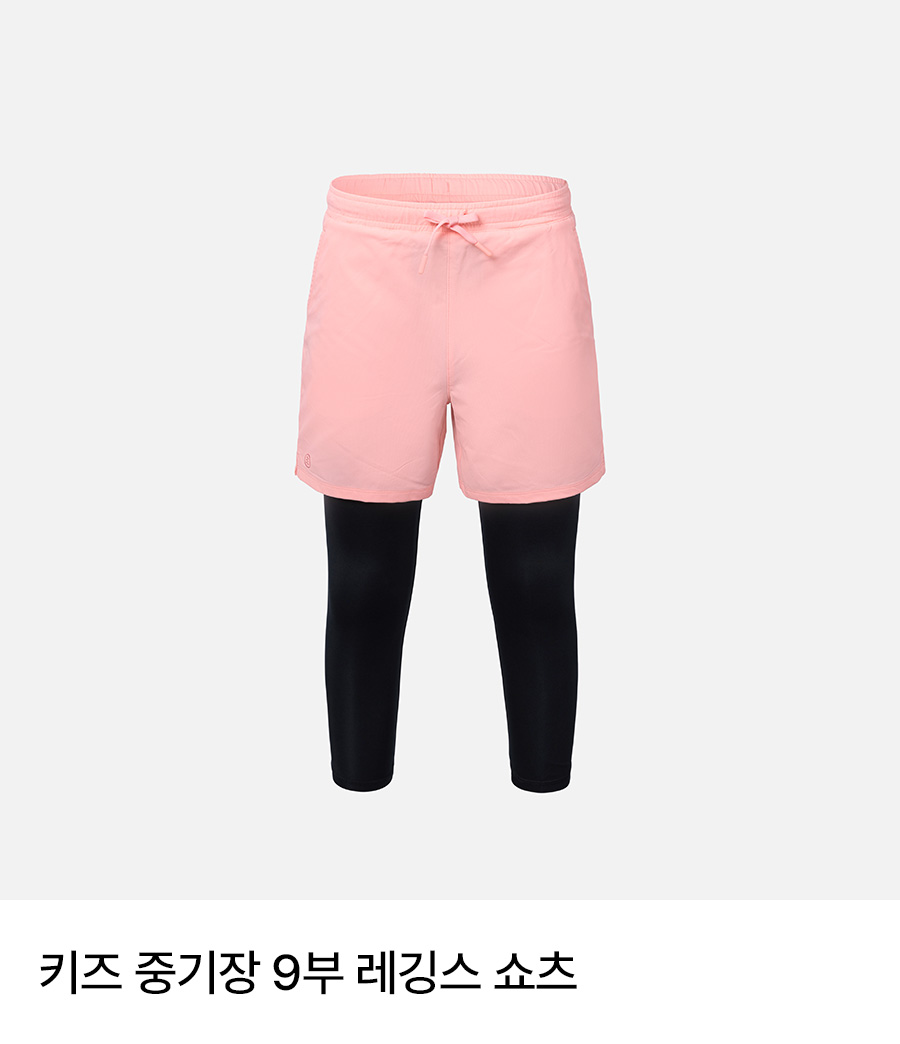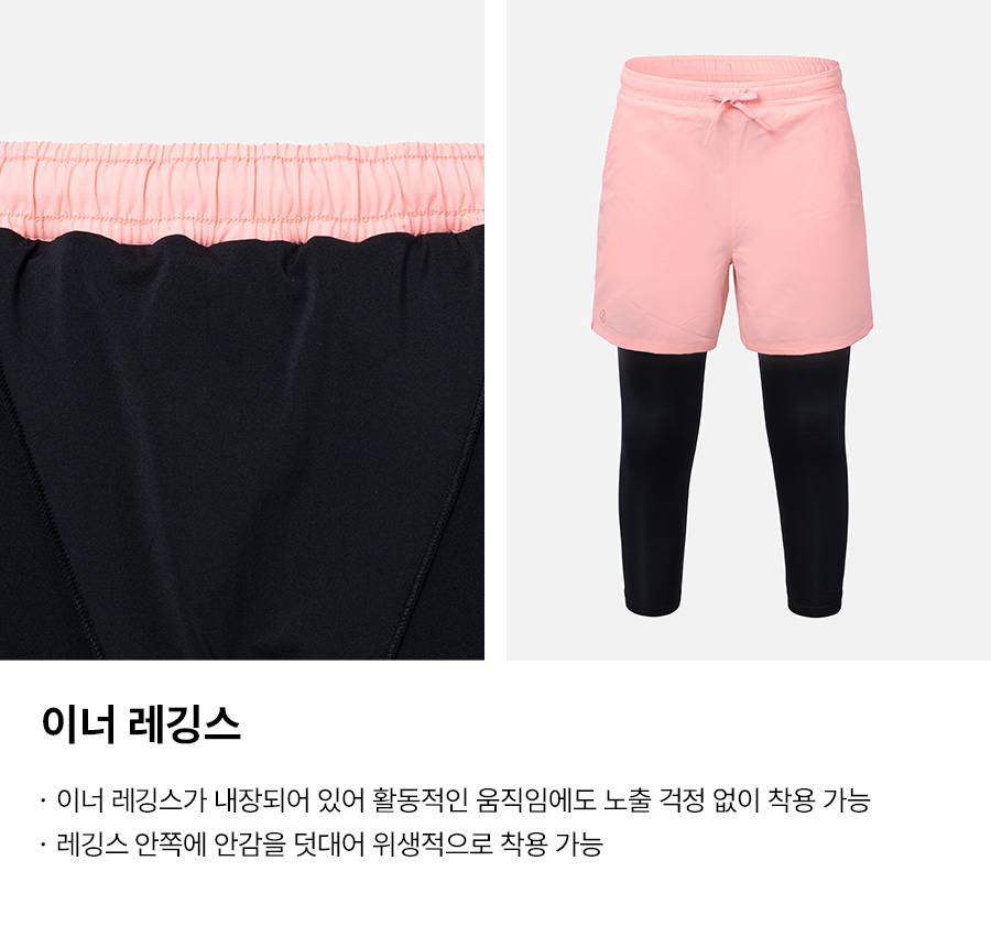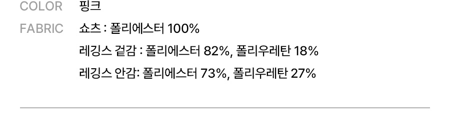 쇼츠: 폴리에스터 100% / 레깅스 겉감: 폴리에스터 82%, 폴리우레탄 18% / 레깅스 안감: 폴리에스터 73%, 폴리우레탄 27%