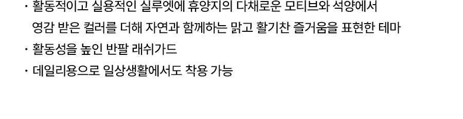 제품을 입고 바닷가나 수영장을 다녀오신 경우, 물 속의 화학성분 및 염분으로 인해 변색이 발생합니다. 땀으로 인한 부분 탈색이 발생할 수 있으니 가능한 한 빨리 수돗물로 세탁하시고 가볍게 두드려서 수분을 뺀 뒤, 직사광선을 피해 그늘에서 건조해주세요.