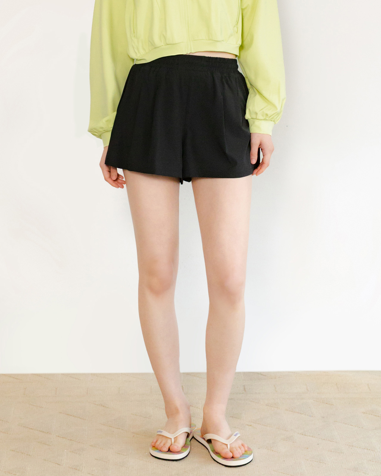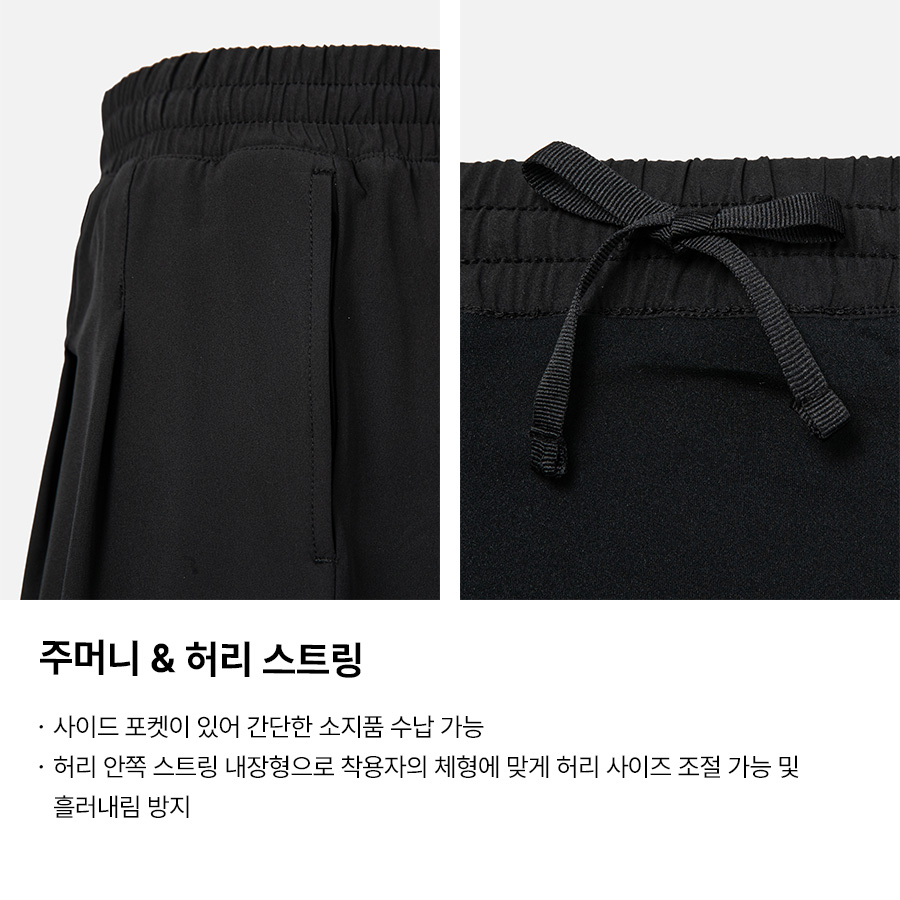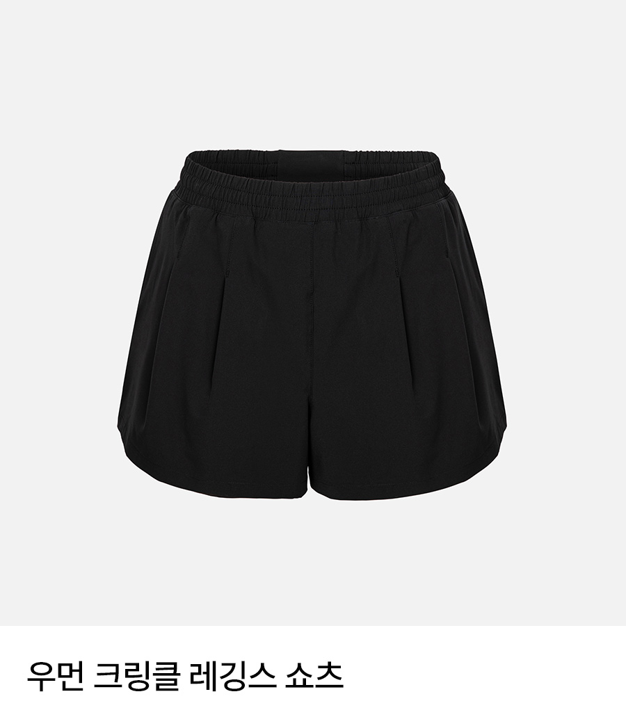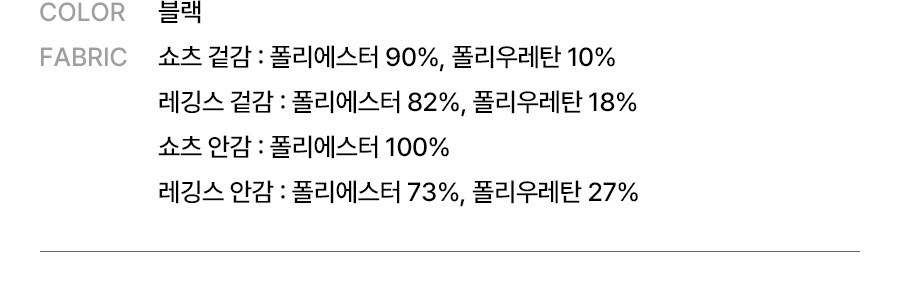 쇼츠: 폴리에스터 90%, 폴리우레탄 10% / 레깅스 겉감: 폴리에스터 82%, 폴리우레탄 18% / 레깅스 안감: 폴리에스터 73%, 폴리우레탄 27%
